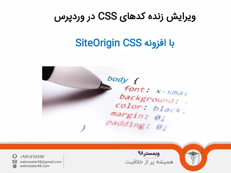 همراهان وبمستر98 موضوع امروز آموزش وردپرس، آموزش افزونه SiteOrigin CSS برای ویرایش زنده کدهای CSS در وردپرس می باشد. CSS یک استاندارد جهانی برای طراحی صفحات وب است و تمام مرورگرها از آن پشتیبانی می کنند. از طریق CSS میتوان تغییرات گسترده ای به راحتی ایجاد کرد به طوری که تمام رنگ ها، فونت ها، موقعیت ها، دکمه ها و… که در صفحات وب مشاهده می کنید حاصل چندین قطعه کد CSS می باشد. در واقع CSS برای سفارشی کردن محتوا کاربرد دارد. اگر بخواهید قسمتی از کدهای CSS را در قالب وردپرس خود ویرایش نمایید نمی دانید باید به کدام قسمت از کدهای فایل style.css بروید و ممکن است دچار سردرگمی شوید. پس نگران نباشید و در ادامه همراه ما باشید با ویرایش زنده کدهای CSS .