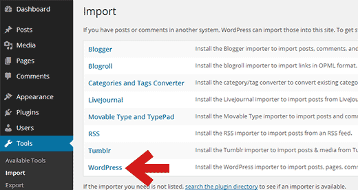 حال شما در این مرحله باید به درون ریزی فایل خود برای استفاده از سایت اقدام نمایید.با رفتن به بخش ابزارها> درون ریزی و در صفحه import وردپرس به شما چندین گزینه های مختلف را نشون میدهد.