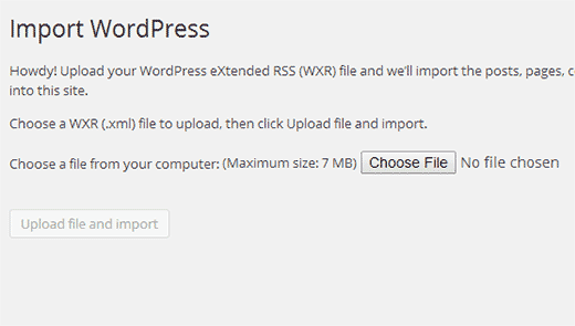 پس از انجام این مراحل شما باید بر روی Activate Plugin و اجرای درون ریزی کلیک کرده و به صفحه بعد وارد شوید.در صفحه وارد شده وردپرس از شما میخواهد فایل خروجی که از قبل تهیه کرده اید را وارد کنید.در اینجا شما باید فایلی را که در مرحله اول Export کرده اید را اپلود نمایید.